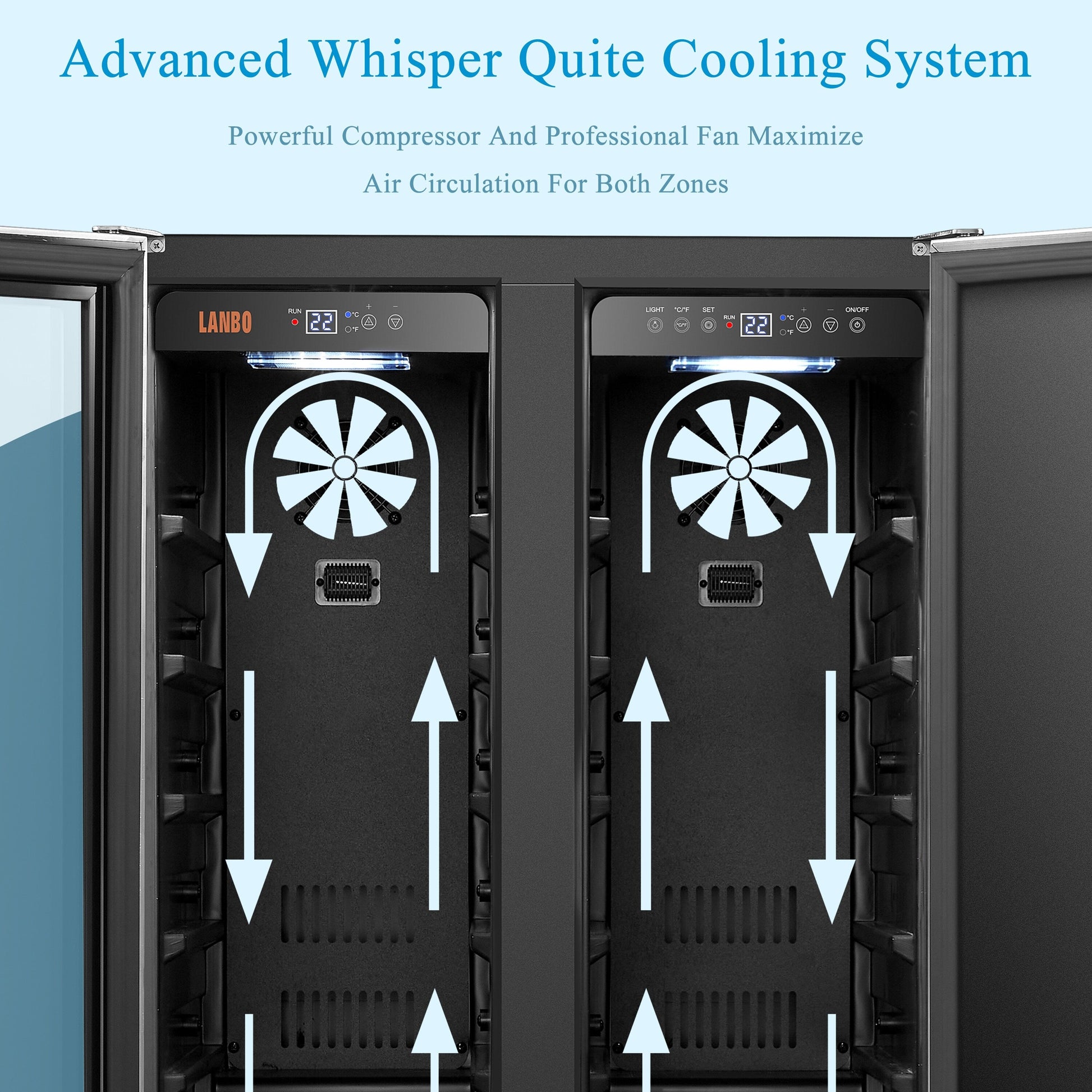 Professionally store your favorite wines and beverages at the perfect temperature with our Lanbo LB36BAA stainless steel and glass French door cooler. Offering 2 separate, independently controlled temperature zones, set your wines with a left zone temperature range of 41 to 64°F and beverages with a right zone temperature range of 39 to 50°F. Powerful, whisper quite compressor and advanced fan air circulating system maintain your wines and beverages at the precise temperature you select. Front-venting design allows you to install directly into your cabinetry for a sophisticated,custom look or display as you choose anywhere as a freestanding model. Stores up to 18 wine bottles standard 750ml Bordeaux size and 55 beverage cans. Lanbo LB36BAA maintains your favorite wine and beverages to perfection. For added convenience store selected food items if you choose in the canned beverage right side.