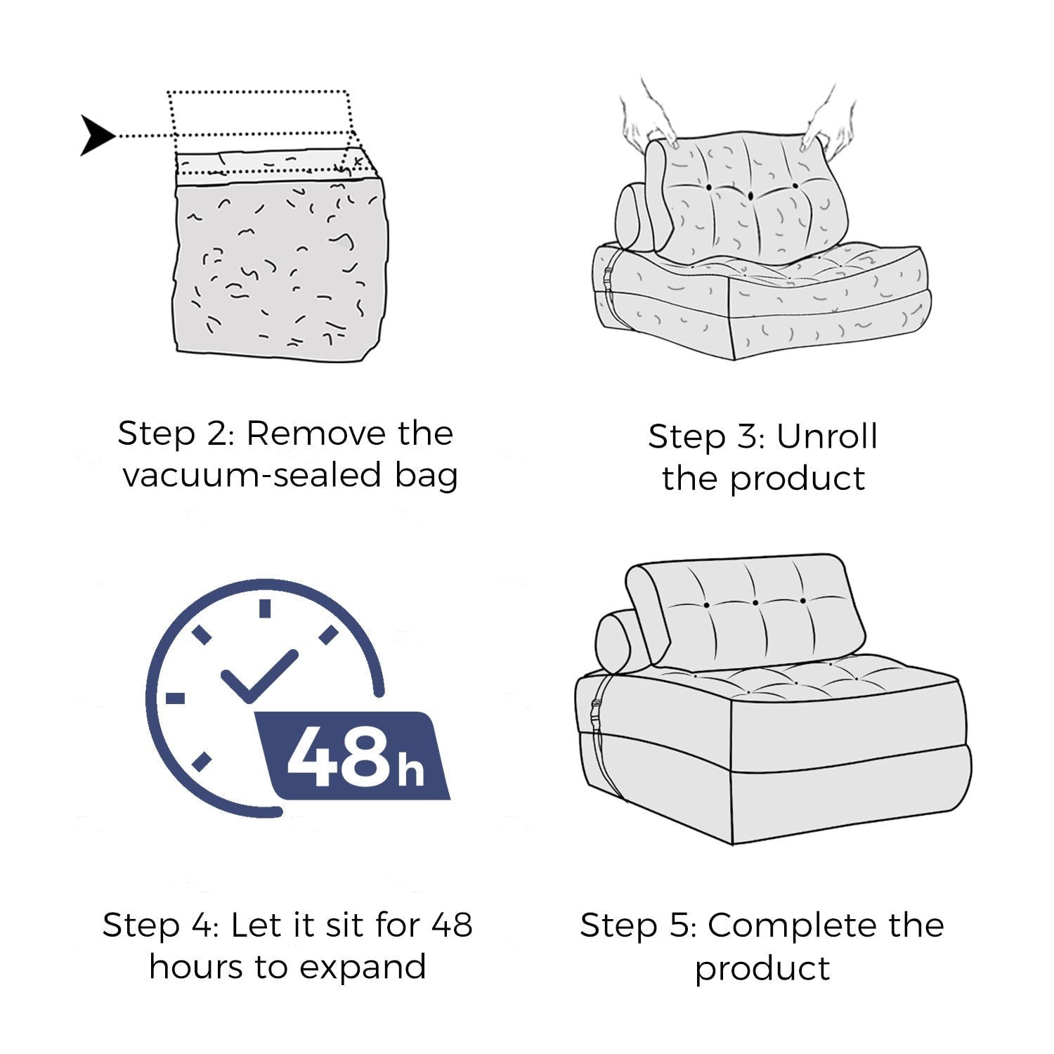 • Livraison et installation faciles : Le produit est compressé et scellé sous vide pour une livraison efficace ; laissez 48 heures après le déballage pour que le canapé-lit retrouve sa forme originale.