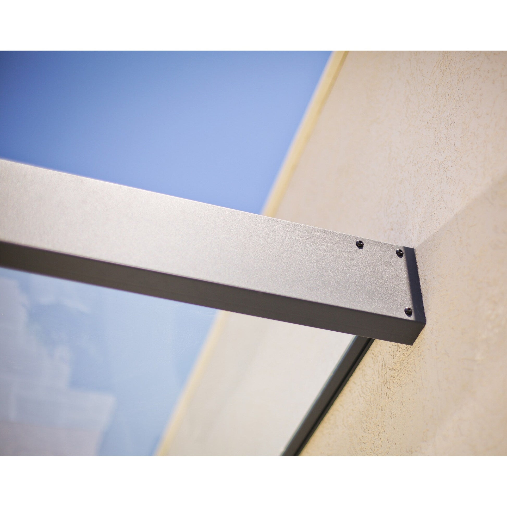 The Sophia Door Awning is the epitome of modern style and functionality. Crafted with precision, the sleek lines and minimalist design of the gray aluminum frame with clear panels create a striking visual and provide a welcoming entrance for residents and guests. The clean line Door Awning has a leak-free and screw-free glazing system with integrated, hidden gutter that channels rainwater. The clear panels are naturally immune to harmful UV rays. This ultra-resilient Porch Awning is easy to install and engineered to withstand harsh weather conditions so that you, your things, and your door are protected for years to come. With the Sophia Door Awning, you get the protection you need in the look you want.